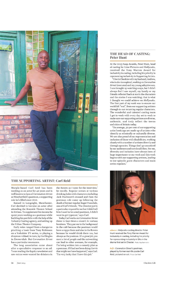 Carl Reid had been very busy working and fundraising for his friend. His friend unfortunately lost his wife to cancer this year. The loss left very young children behind. They now have to cope without their mum. Besides working as a supporting actor on Coronation Street. He felt surprised when they chose him for the June 2024 edition of the Cheshire Life magazine.